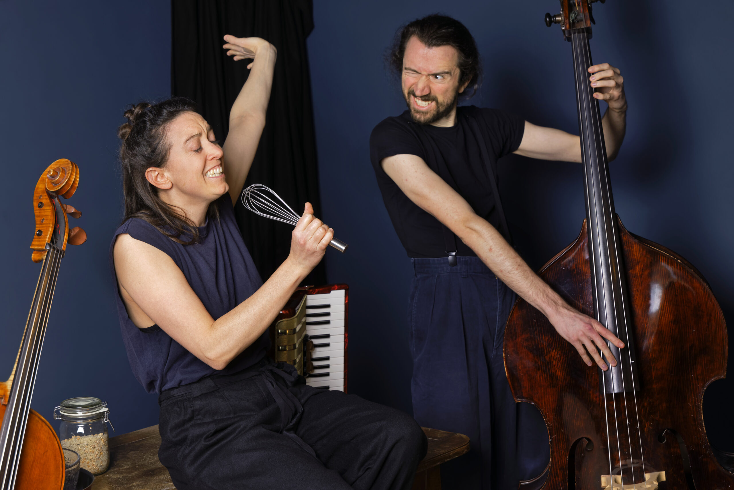 mit Putzkübel, Getreidekörnern, Kontrabass, Schwingbesen, Cello, Handtüechli, Zeitung, Örgeli
