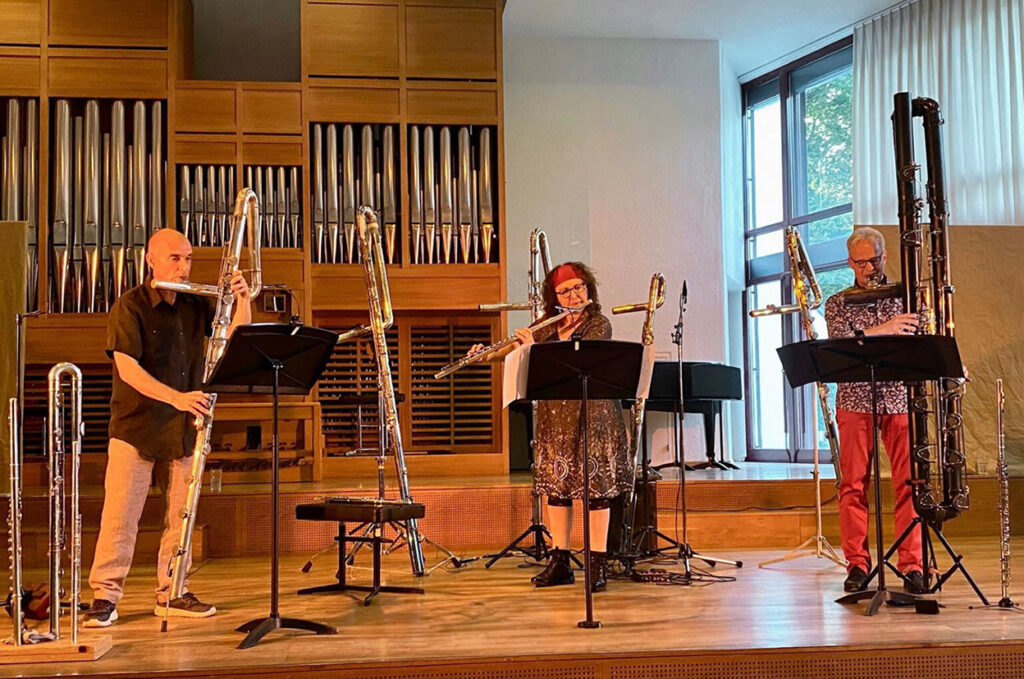 - Drei Flötisten spielen neben der Konzertquerflöte auch mit Alt-, Bass- und Kontrabassflöte. Faszinierendes, intensives Klangerlebnis.